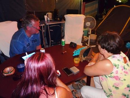 Elfried zet zelfs de stoel buiten de tent om in de zon te zitten!