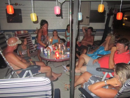 Het koelt vanavond best hard af, en de meeste dames hebben wat warmers aangedaan. Corina zit zelfs in haar huispak!. Goed 1 uur later zit iedereen bij de Ooijtjes stuk, en gaat ieder naar zijn eigen plek. Arjan wil nog blijven, en overlegt met zijn moeder. "Ach laat hem nog maar even, wij zijn nog niet naar bed". Arjan ook weer blij!