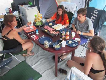 Terwijl Joey en ik met het net bezig waren, hebben de dames vlees gehaald. Dus niet veel later knettert de bakplaat goed, en kunnen we gaan eten.