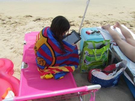 Het is alweer gruwelijk warm, dus we besluiten om naar het strand te gaan. Joey is nog helemaal lek gestoken, dus die wil niet in het zoute water. Hij en Jessica gaan naar het zwembad.