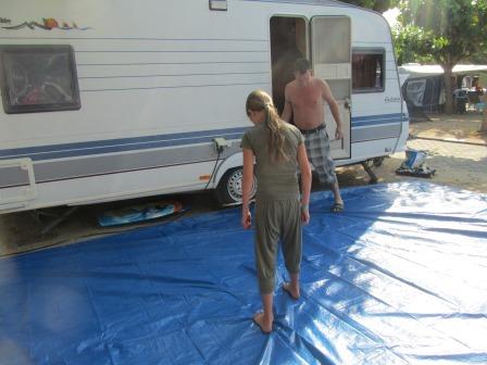 Tegen 6:00 uur worden we gewekt. Nee, niet door de Ooijtjes, maar weer regen! Dus weer snel eruit om de was binnen te halen. En tegen 8:00 uur gaat de caravandeur open... Nee, weer niet de Ooijtjes, maar onze Jessica. Ze voelt zich weer zo beroerd, naar het toilet geweest, én overgegeven, ocherm. Ze wilt even bij mama liggen.