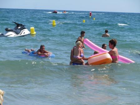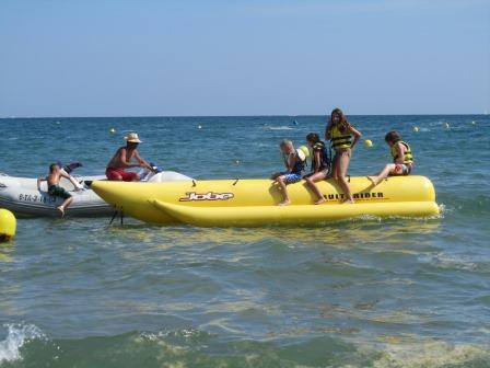 Even later gaan de kleintjes op de banaan. Claudia wil eerst niet, maar dan zijn ze met te weinig man. Dus vragen ze mij! Eh, nee, dank je. Uiteindelijk gaat Claudia toch mee! Dus spullen aan, en gaan met die banaan!