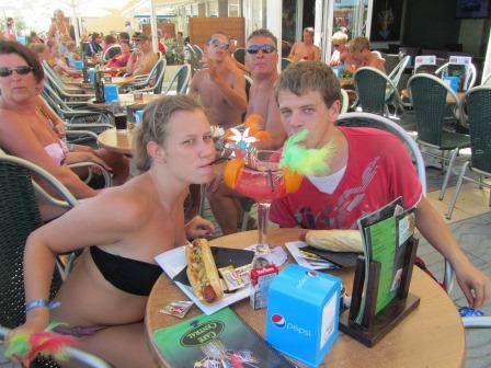 De Ooijtjes zijn vanaf het strand nog naar het zwembad gegaan. De dames hebben daar nog in de poolbar aan de Mojito gezeten. En daar heeft Angela er maar een paar van nodig om lekker jolig te worden. "Kijk, nog een paar centjes over". In de spaarpot ermee. Gekke fluit!