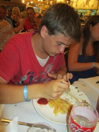 Alleen Claudia heeft Calamaris, de rest heeft een visje. Maar sommigen hebben nog wel moeite met het fileren, of niet Joey?