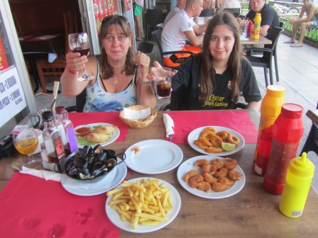 Vanaf het eten gaan we nog even langs het strand: Claudia wil kijken of ze nog iets kan scoren bij de "zwarte mennekes". Maar helaas, ze zijn er wel, maar de policia local staat er, en alles blijft ingepakt. Nou ja, er komen nog dagen genoeg. Dus dan maar een mooie foto van moeder en dochter met Salou op de achtergrond. We missen nog wel een dochter (en schoonzoon!) maar die komen over 2 nachtjes slapen.