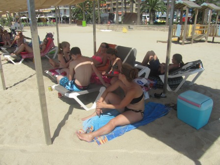 Tja, voor even, er komt een aso familie aan, en neemt alle plek in. Zitten zowat bij Joey op zijn strandlaken. Ze hebben meer schaduw van onze parasol dan wijzelf. Het is wel vrolijk, we worden gratis getrakteerd op Radio Hollandio. Pff, ruimte genoeg, en moeten gewoon ons wegdrukken. Uiteindelijk verzet ik zelfs onze parasol aan de andere kant omdat daar nog ruimte zat is!