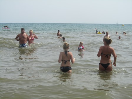 Ondanks dat er een lichte sluierbewolking is, is het weer gruwelijk warm. Na even gelegen te hebben, pakt Corina het luchtbedje en gaat de zee in!