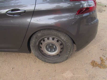 De mannen laten het wiel zien dat is gesneuveld. Van de band is niets meer over, het is gewoon een kale velg. Niet fijn om met 140km/u op de linkse baan zoiets mee te maken! En het "leenwiel" ziet er wel apart uit!