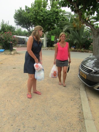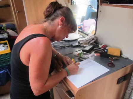 Als ik terug kom, komt Corina uit de caravan. Ze kan niet slapen. Het is dreigend, en er is regen voorspeld. Van zwembad of het strand komt het vandaag dus niet. Tijdens onze voorbereiding voor dit jaar, wisten we niet meer precies wat er nou in de caravan lag. Dus lijsten meegenomen, en beginnen met inventariseren.