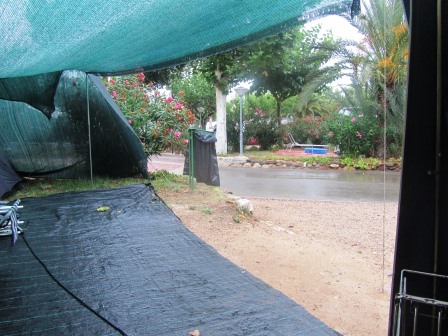 Ik ben nog gruwelijk moe, en zo rond 14:44u ga ik even liggen. Rond 15:55u schrik ik wakker. Zoals jullie op de foto kunnen zien, zijn de gaatjes hier inmiddels open. Het regent niet zo hard als toen we aankwamen, maar het regent wel door. Zo heeft het groene doek nog een extra functie: Het water verzamelt zich op het laagste punt, en sijpelt daar door. Bij de rest van het doek valt dan ook veel minder nattigheid. Alleen hangt ie dan wel behoorlijk door.