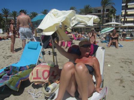 Onze Jessica zit er maar bezorgd bij. Gelukkig is de wind iets geluwd, en kan ie op het bedje rusten. In de schaduw, onder de parasol.